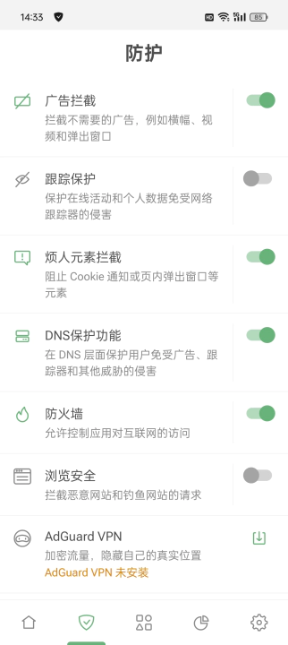 AdGuard在使用时并不需要把所有防护方式全部打开。经过测试,其中有两项一旦打开会明显影响网速。